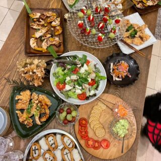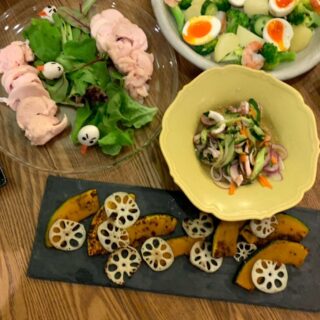 2020年の2回目ハロウィンパーティーは、大人数で楽しむおうちごはん🎃オレンジ色のパエリア、顔つきオバケシュウマイ、きゅうりのピンチョスなど、見た目も楽しいハロウィンメニューで盛り上がりました。