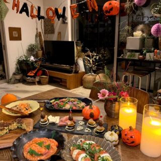 2023年のハロウィンは、友人たちと持ち寄りパーティー🎃チーズほうきやかぼちゃ型ごはんのキーマカレー、ブルスケッタ、まるごとかぼちゃプリンなど、見た目も楽しいメニューでハロウィン気分満点でした。