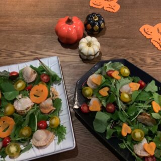 2020年のハロウィンは、サーモンのお刺身をジャックオーランタン風に、レンコンをドクロ風にアレンジ🎃💀おうちごはんでも簡単にハロウィン気分を楽しめるアイデアメニューです。