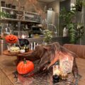 週末のハロウィンパーティに合わせてディスプレイを少しアレンジ。ガーランドとタペストリーで賑やかに。お土産の切り株鉢植えがハロウィンにぴったりでした。