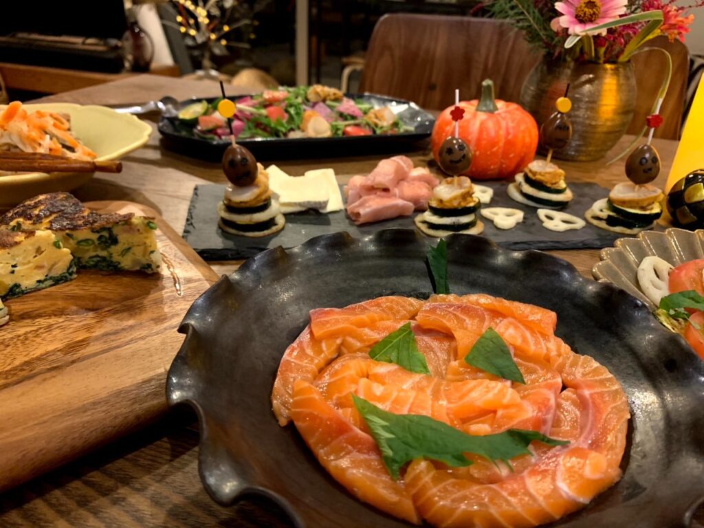 この年のハロウィンごはんは、サーモンのお刺身をジャックオーランタン風にアレンジ!